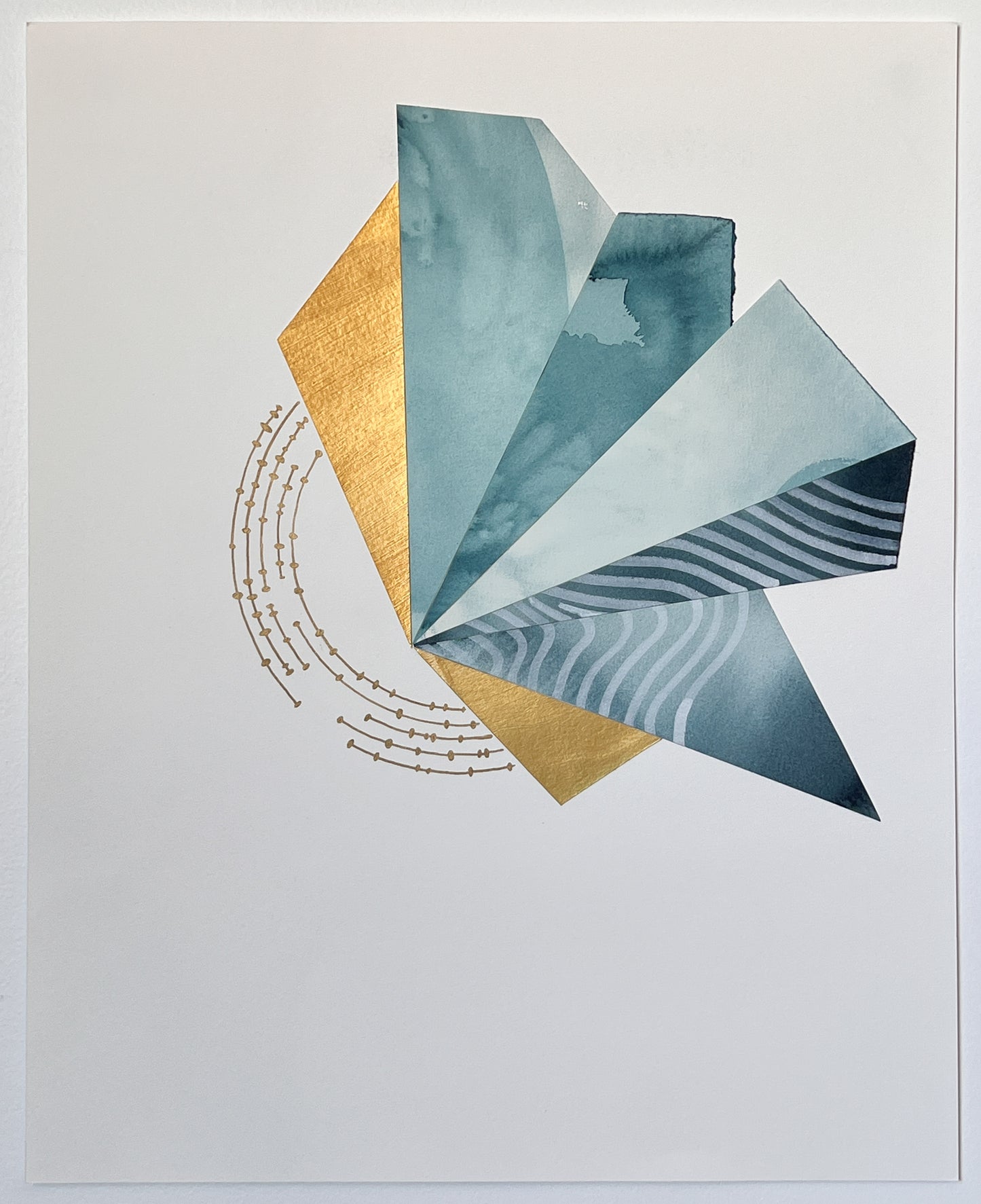 mixed media collage with ink, watercolor, metallic detailing on vellum overlay mounted on watercolor paper